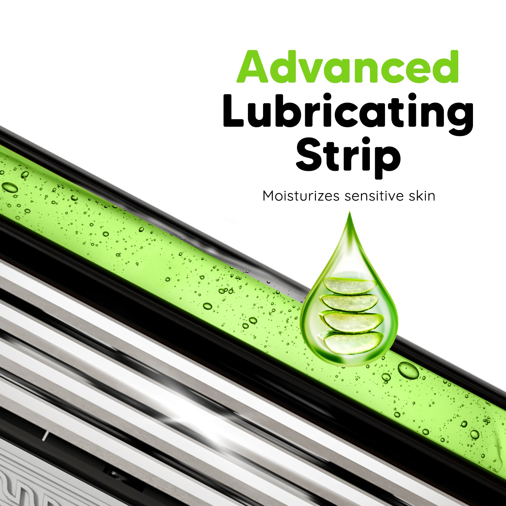 Lubricating Strip infused with Aloe Vera & Vitamin E for smooth, irritation-free shaving.
